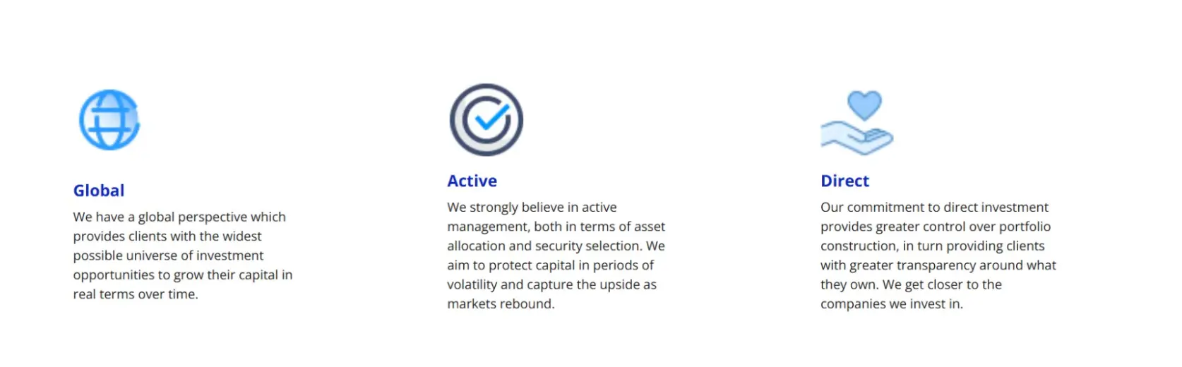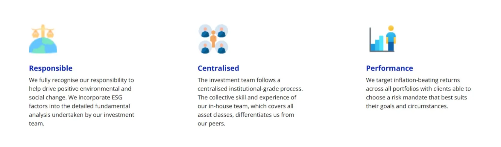We build the relationship with you based on your preferences. The frequency and format of meetings are tailored to suit you – you have direct access to your investment manager and also have the option of accessing your portfolio via our dedicated online portal.
